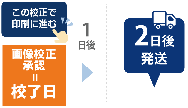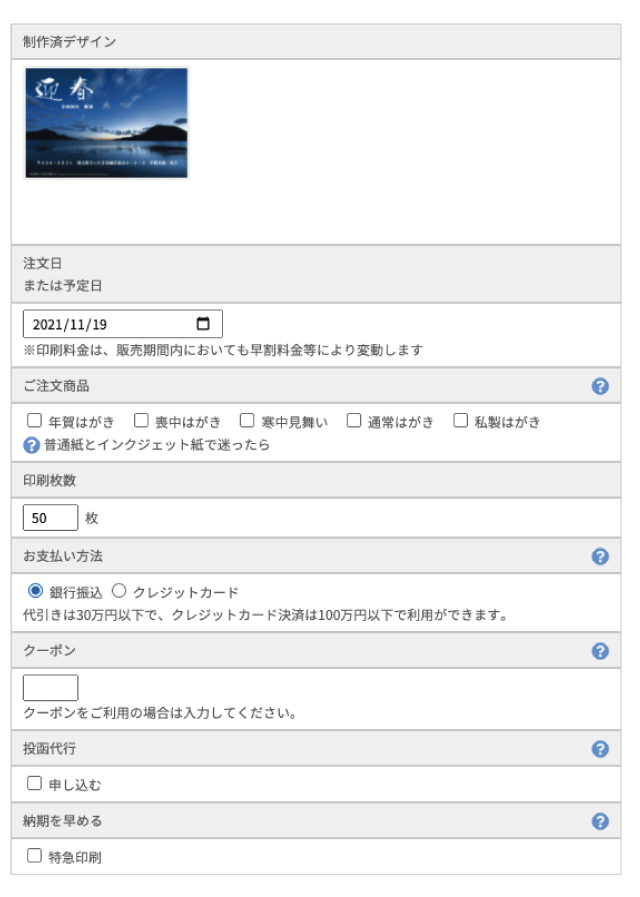 はがきデザイナーで制作したデザインの通常発送日は、入金確認後5 日後が発送日となります。 これが2 日後に早まるサービスです。枚数が500 枚以上やオプションがある場合は、発送予定日は後倒しになります。