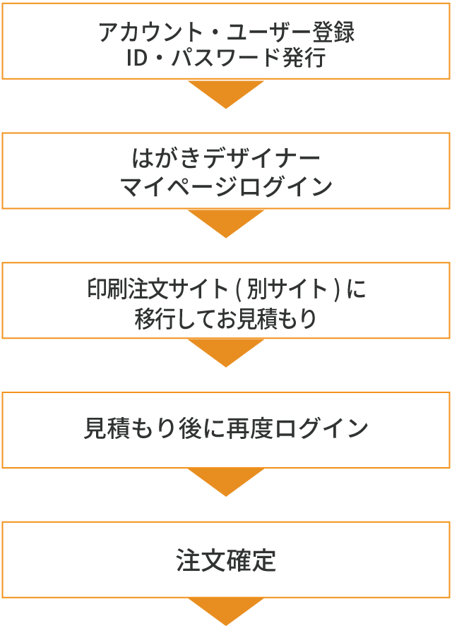 はがきデザイナーのマイページにログインして[印刷注文] →印刷注文サイト(別サイトふち無しはがき本舗)のお見積もり画面に移動します。お見積もり後、再度ログインしていただき[見積もり内容で注文する]のボタンをクリックすることで、正式にご注文が確定します。