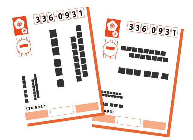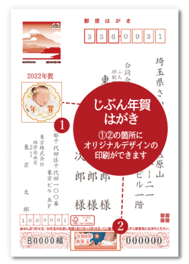 年賀はがきの宛名面、切手部分の下部とくじ番号の中央部分に、ご自身でデザインしたデザインを印刷してお客さまだけの年賀はがきを制作できます。
