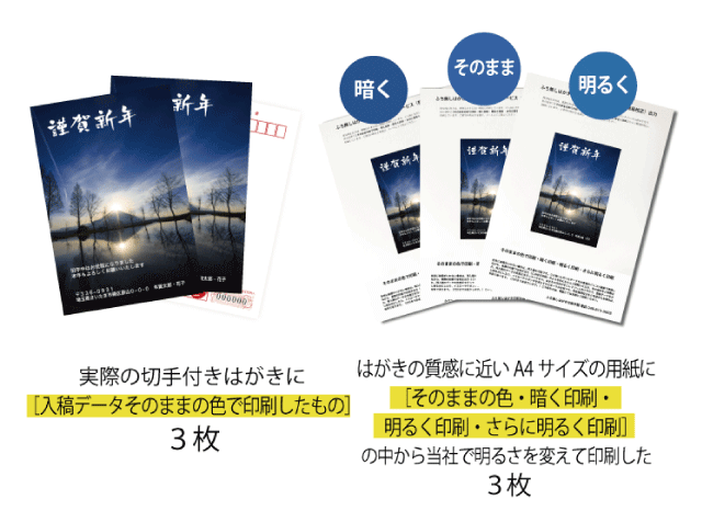 実際の印刷がどんな色合いになるのか?写真の解像度は大丈夫か?など現物のはがきに印刷して送付するサービスです。