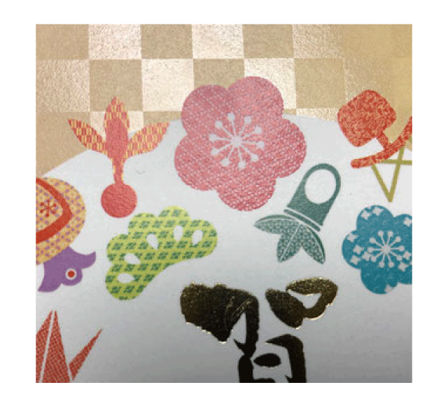 はがきデザイナーで、箔押しスタンプを選択した場合は、金箔または銀箔の印刷を施します。