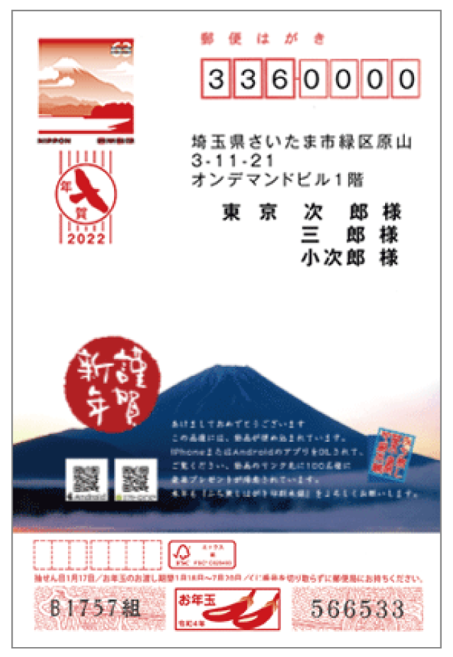 宛名面にも絵柄や写真をレイアウトし印刷するサービスです。データ入稿でのみご注文いただけます。
