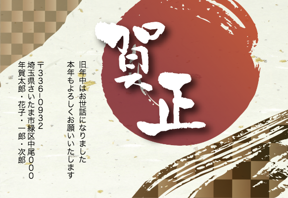 和柄でシックにデザインしているので落ち着いた印象に仕上がります。初日の出の中に描かかれた賀正が年始の気分を高めてくれます。