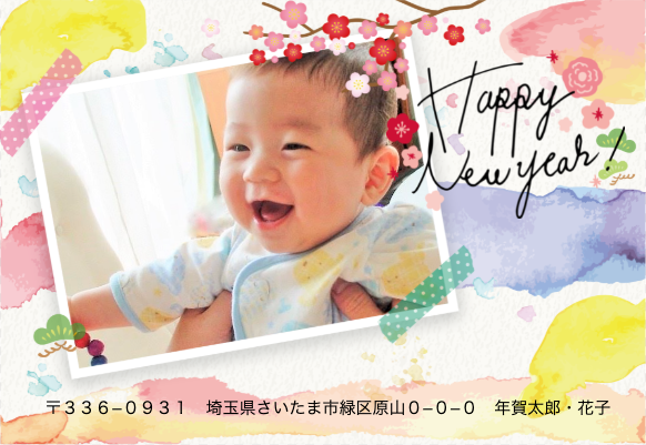 色とりどりの鮮やかな絵具で彩ったような素敵なデザインです。賀詞や文字は自由に変えることができます!
