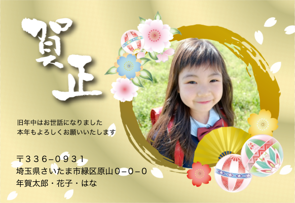 淡い色の毬や花を周りにあしらった中に写真を入れられるデザインです。和キュートに仕上がります。