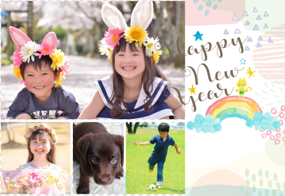 パステルカラーのイラストが可愛らしい写真フレーム年賀状です。大小4枚の写真を選んで入れることができます!