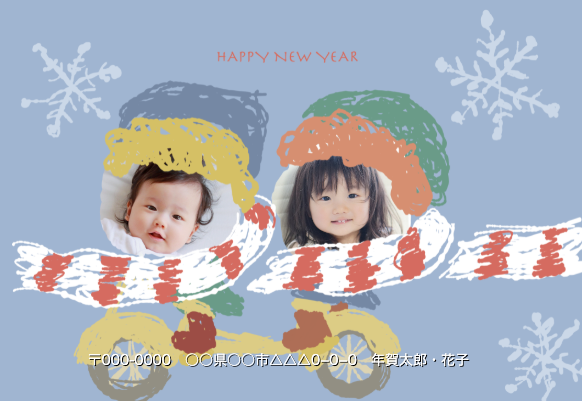 手書き風のイラストが可愛らしい写真年賀状テンプレートです。雪の中、2人で楽しくサイクリング。顔部分がフレームになっています。