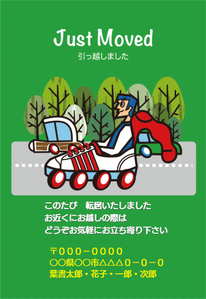 スニーカーを模した車で旅立っていく元気なイメージのテンプレートです。