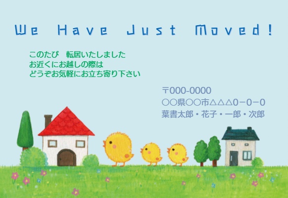 青空の中、可愛いひよこたちが引越していく姿を表したテンプレートです。