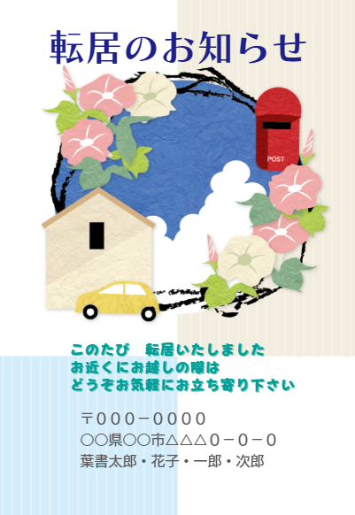 新居と車で引越しを表現し、朝顔で夏を表しているテンプレートです。