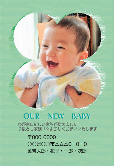クローバーがくり抜かれた中に愛くるしいお写真を入れられるテンプレートです。グリーンで元気いっぱいな中にとっておきの一枚をお選びください。