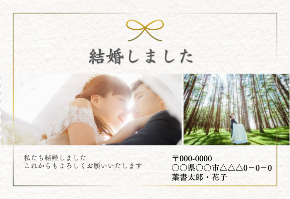 ゴールドのリボンに囲まれた中に写真を2枚入れられるテンプレートです。左の写真は横長なのでダイナミックが入れられます。