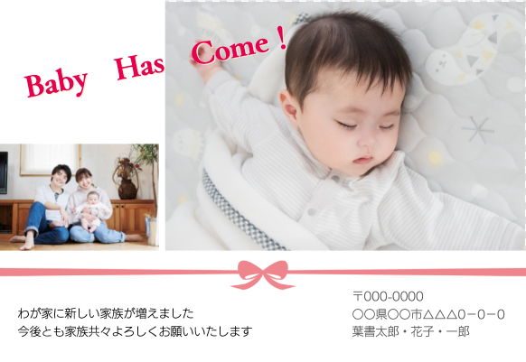 熨斗のようなデザインでリボンを型取り、さり気なくキュートに仕上げたテンプレートです。お気に入りの写真を大小2枚入れられます。