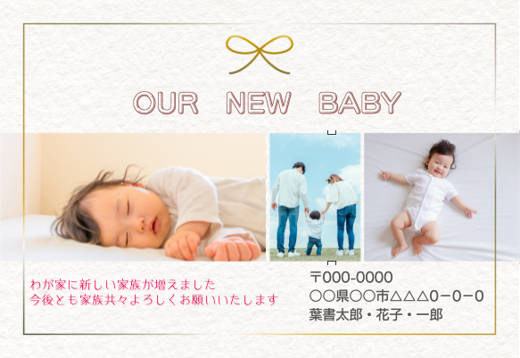 ゴールドのリボンに囲まれた中に大小写真を3枚入れられます。家族写真はもちろん、可愛らしいお子様のお写真も入れられるのでおすすめです。