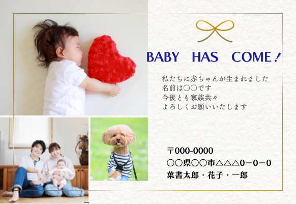 ゴールド地リボンに囲まれた中に写真を大小3枚入れられるテンプレートです。家族写真や愛くるしいお子様をご紹介するの最適のテンプレートです。