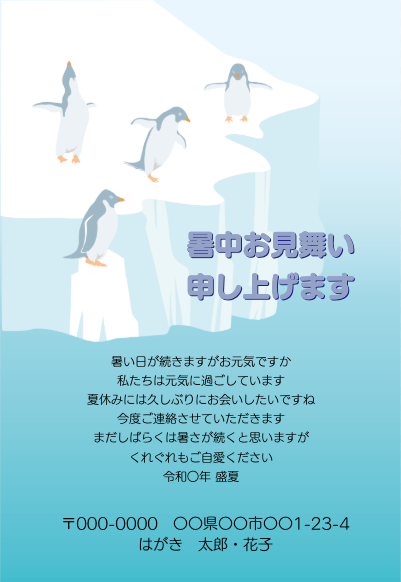 氷河の上で楽しそうに戯れるペンギンたちが夏の暑さの中に涼しさを感じさせてくれるテンプレートです。