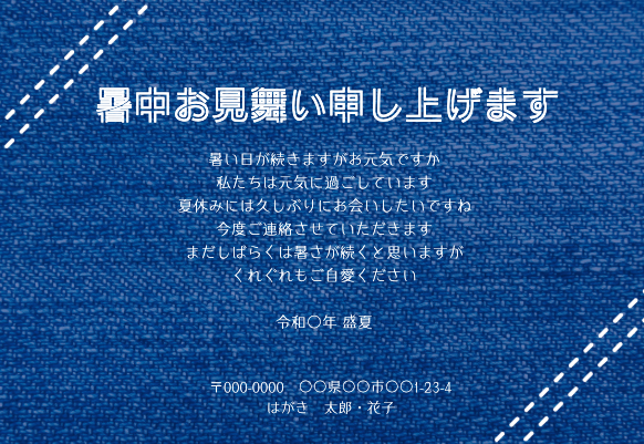 デニムの背景に、白いステッチが可愛らしい、シンプルなテンプレートです。お好きなフォントを選んで、自分好みにアレンジしてみては。