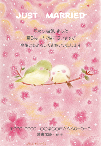 小鳥が二匹、幸せそうに寄り添った結婚祝いテンプレートです。優しい色合いがほんわか幸せを運びます。