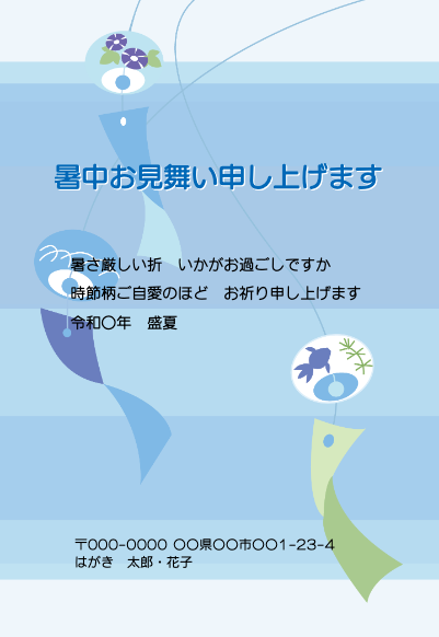 涼し気な色合いの背景に、風鈴のイラストが描かれた、シンプルな暑中見舞いはがきです。法人にもピッタリ。