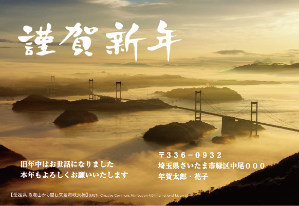 愛媛県亀老山から望む來島海峡大橋の写真です。絶景写真とともに、新年のご挨拶はいかがでしょうか。