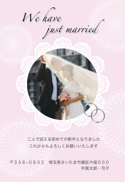 はがきデザイナー、写真入りの優しいイメージのご結婚報告年賀状いかがでしょうか。