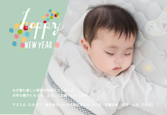 くすみカラーで斜めに切り替えを入れた爽やかな印象のデザインです。大きな写真を入れることができ、優しい雰囲気に仕上がります。