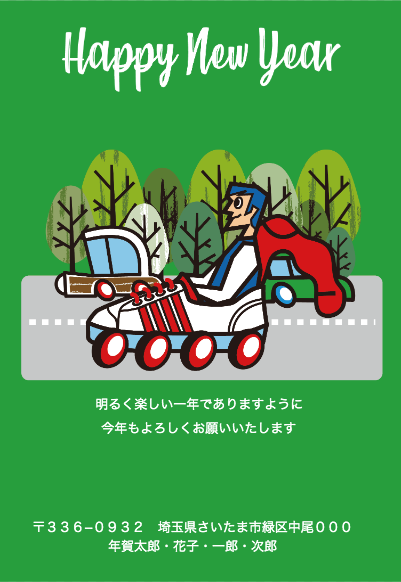 はがきデザイナー、靴の車でビューン。カラフルな楽しいポップな年賀状いかがでしょうか。