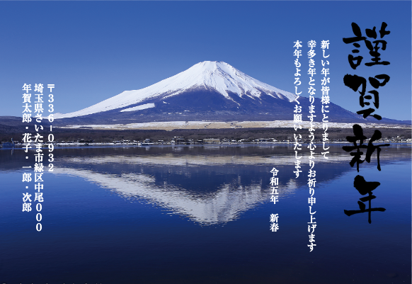 富士の絶景写真を全面にデザインした年賀状です。おめでたい富士山の年賀状で新年のご挨拶はいかがでしょうか。