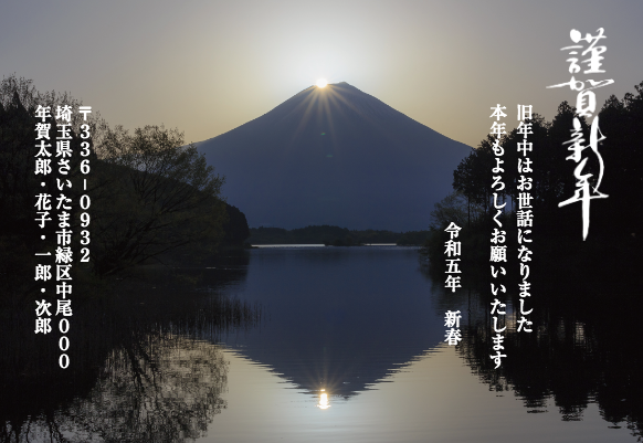 富士の絶景写真を全面にデザインした年賀状です。おめでたい富士山の年賀状で新年のご挨拶はいかがでしょうか。