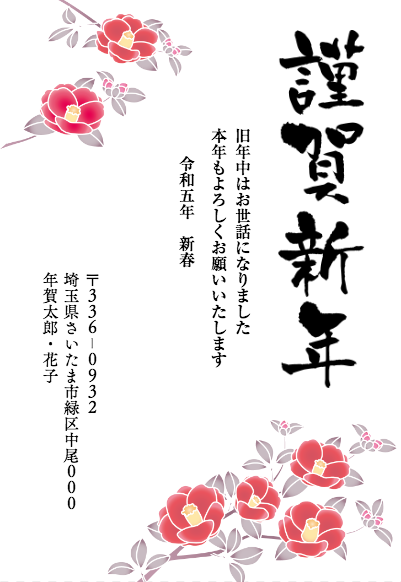 はがきデザイナーの年賀状テンプレートです。椿の淡い色合いがとっても素敵です。ご家庭用にはもちろん、法人向けにもご利用いただけます。