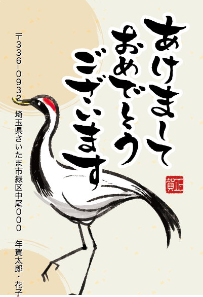 はがきデザイナーのテンプレートです。落ち着いた背景に、鶴のイラストが素敵な年賀状です。
