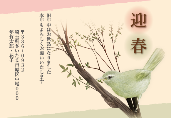 はがきデザイナーのテンプレートです。落ち着いた背景にうぐいすのイラストが素敵です。温かみのある年賀状です。