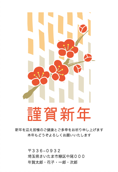 はがきデザイナーのテンプレートです。梅のイラストの淡い色合いで、優しいイメージの年賀状です。